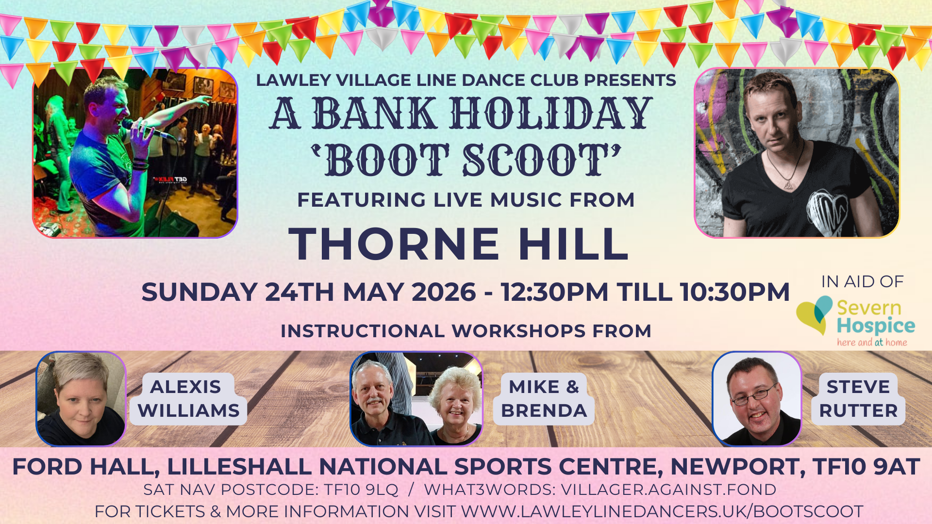 Join us for our Bank Holiday Boot Scoot on Sunday 24th May 2026 featuring Live Music from the amazing Thorne Hill with instructional workshops throughout the day from Alexis Williams, Steve Rutter and Mike & Brenda. Tickets on Sale Now.